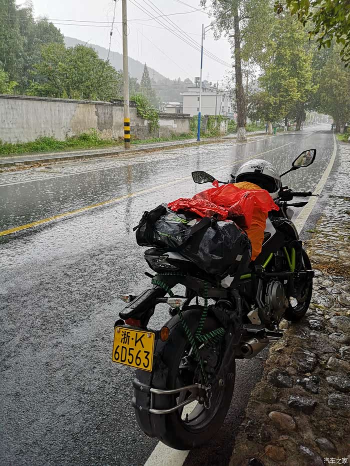还没考虑好呢,雨突然就来了。这下好了,不用犹豫了。我在穿雨衣的时候,前面几十米有个骑着带“执法”字样电动车的小伙子冲我招手,说“跟我走,带你去避雨”。当时心里特别感动,穿好雨衣就决定追过去。可惜一不留神,没看清他从哪里拐进去了,就这样跟丢了...于是自己一个人沿着主路继续往前骑