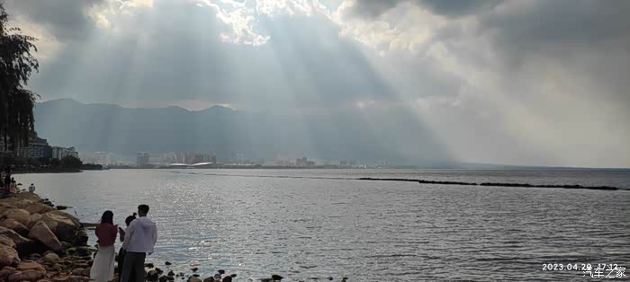 到了洱海边,阳光穿过云朵往下照射的景象