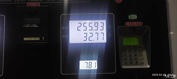 加油量32.77升。呆会进入云南境内,油价会涨一毛多