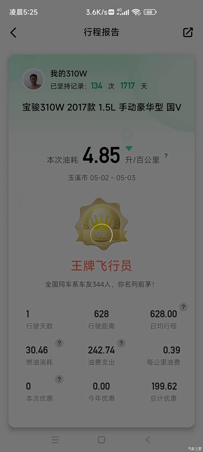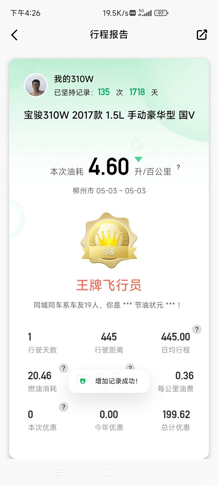 4.85升/百公里,还不错,还能控制在5升以下