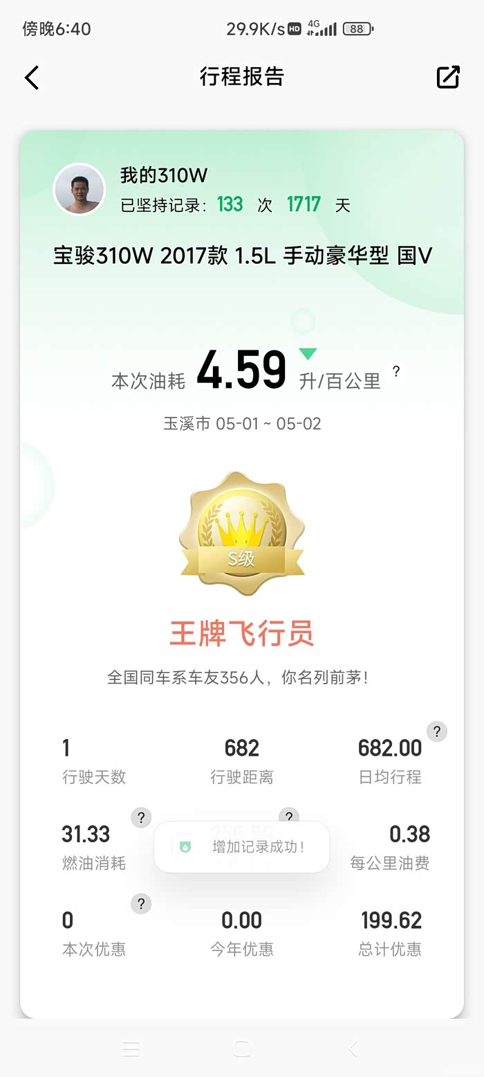 输入到“小熊油耗”APP里,计算出此次油耗为5.34升/百公里,跟上次油耗差不多,还是没能降到5升以下