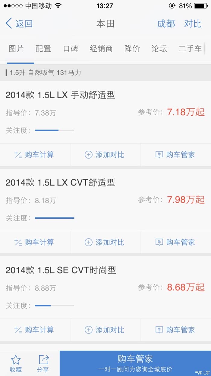 进入你要购买的车辆,价格优惠价格就出来了,至少自己心里也有一个数,对吧,里面还有400电话,可以直接打过去让工作人员帮你询价以及到哪个4S店看车