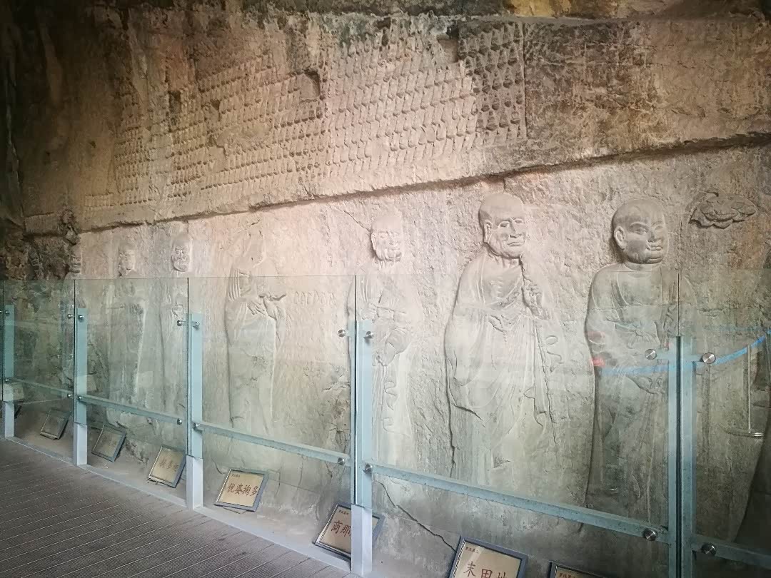擂鼓台中洞,该窟造像为礼忏灭罪的“一万五千佛”。以正壁高坛上善跏趺坐弥勒像为主尊,洞窟四壁刻有二十五身传法比丘及《佛说阿弥陀经》、《金刚般若波罗密经》等佛经。