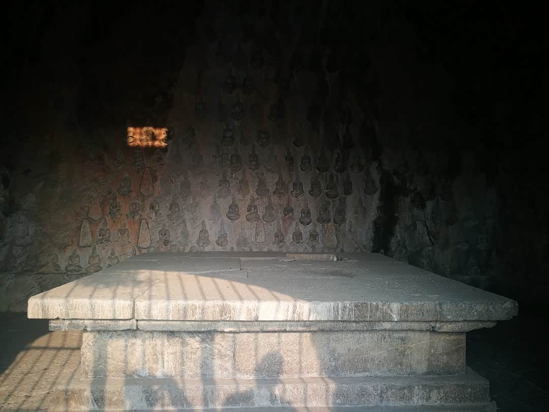 擂鼓台南洞,地面中央砌有方坛,四壁及窟顶结跏趺坐于莲座上的小坐像。现存700余尊,横向成排,上下交错对应。