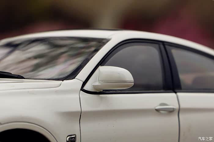 宝马的M系列车型使用这种带有拐角式的后视镜,除外观更美观外,也能在一定程度上降低风阻系数,进一步提高空气动力学,不过这个设计在普通版车型上是没有的。模型后视镜为塑料材质,不可活动,像这种拐角式的后视镜,开模的确是不太方便,但模型还原的型准整体还是可以的,不过外壳上的转向灯罩细节有待进一步还原。