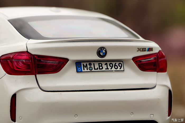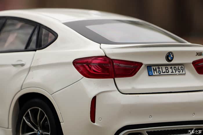 上图可以看出后备箱的缝隙明显略大,不过“X6 M”的车型标识为金属独刻片,质感还是有的。另外个人觉得尾灯的分色表现很细腻,要比大灯好不少,而且灯罩也几乎用肉眼看不到什么瑕疵。后保险杠处的泊车雷达模型也有还原。