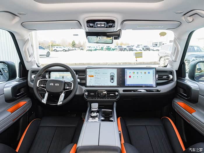 BJ40 魔核版延续了纯油bj40的内饰,三连屏让副驾驶也能有一个娱乐活动区域!成熟稳重的设计中,又不失年轻的特点!