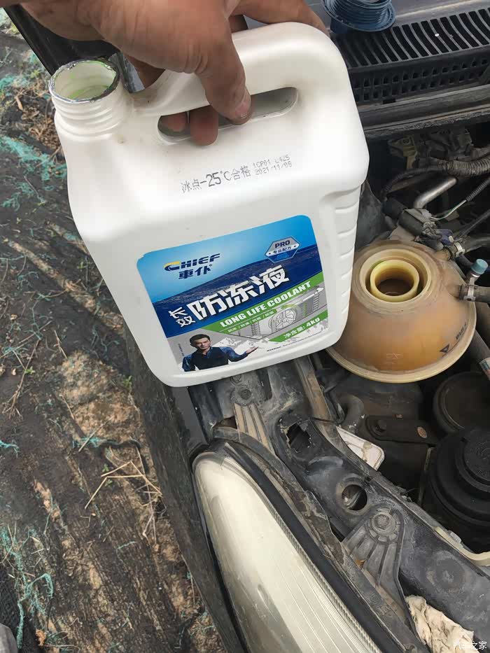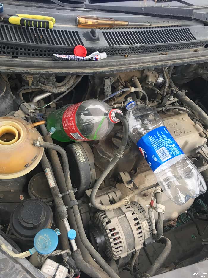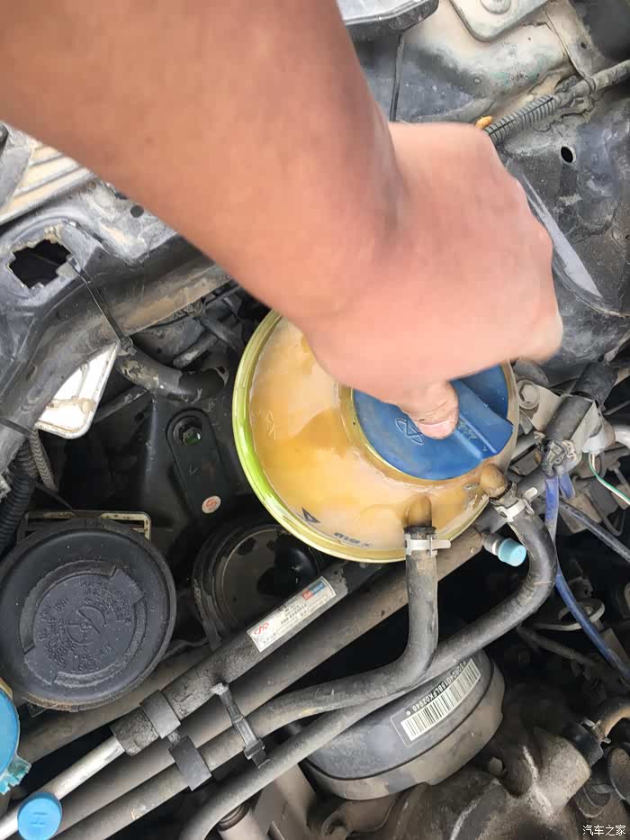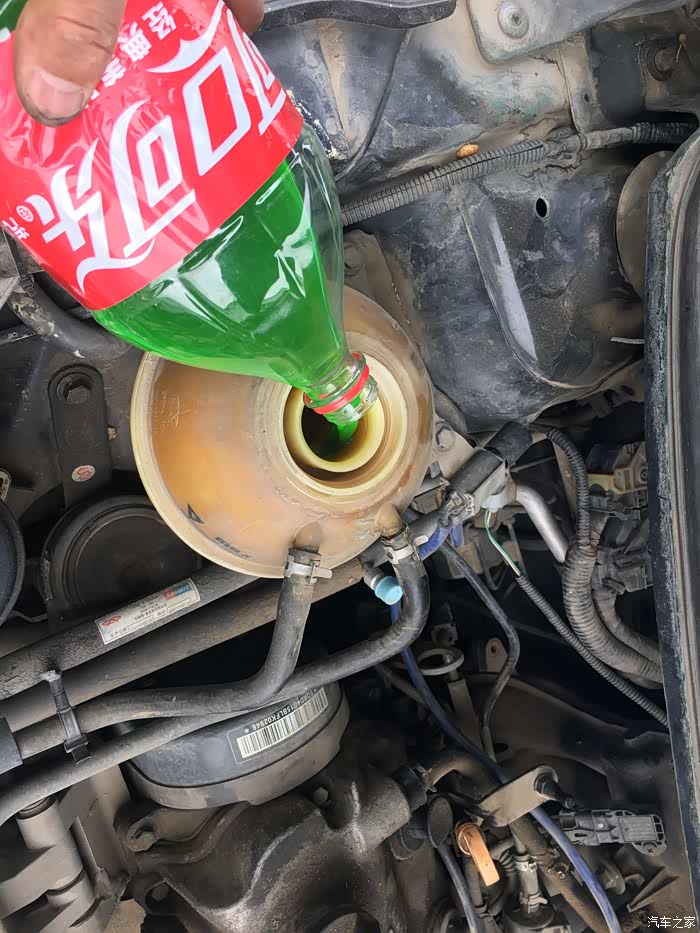 继续加可乐,水壶加多半壶后着车...水温上来后踩两脚油门,稳定在2000转排气....然后水壶继续加冷却液......此时车不要熄火!