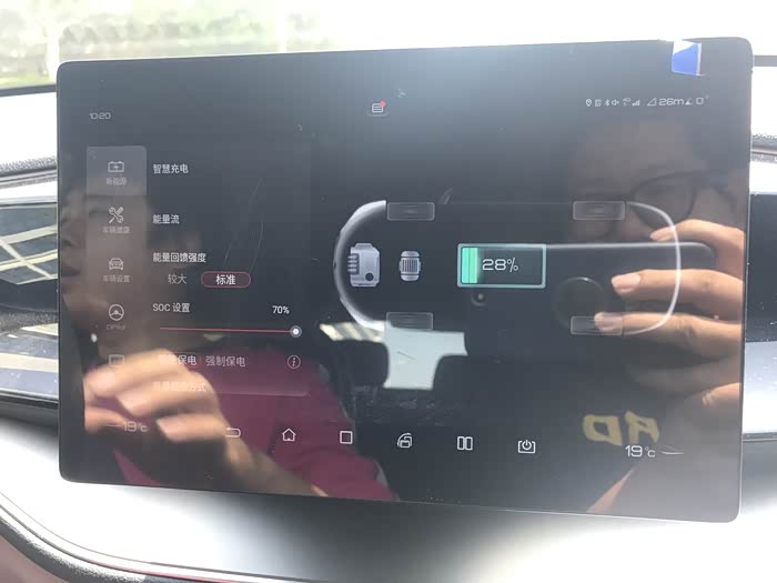 由于原车电量为20%,为了避免试驾途中电量被反冲至25%以上影响馈电状态下的测试,我直接将SOC值拉到最大。同时发现了这个能量流界面竟然是可以实时显示的,我们借此观察了下DM-i技术的驱动模式逻辑。如图,停车状态下发动机和电机都处于一个灰色状态。