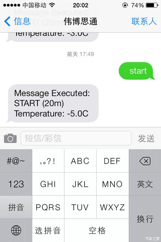 短信指令发出后大概3秒钟左右,系统会给你的手机回一条短信,说明系统开始工作,同时显示系统热车20分钟,室外气温-5度。