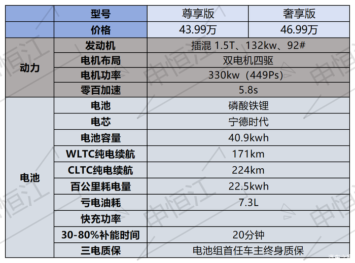 1,动力:插混动力,1.5T涡轮增压发动机、132kw的功率、喝92号汽油。双电机四驱、电机功率330kw(449Ps)、零百加速5.8秒。