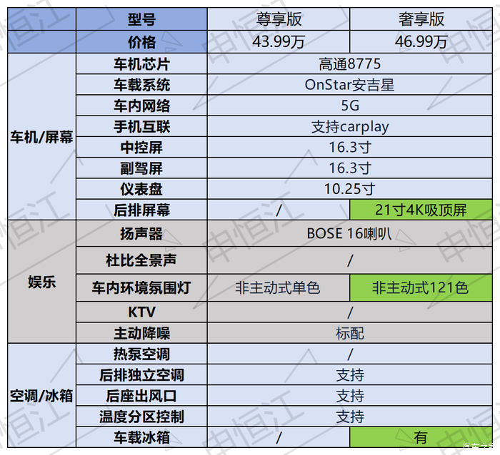 1,车机芯片高通8775、车机系统安吉星、5G网络、支持carplay互联、中控屏副驾屏仪表盘是并联在一起。高配支持21寸4K吸顶屏,低配是没有的,也不支持选配。