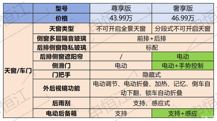 1,天窗类型,因为高配带有吸顶屏,所以是分段式不可开启天窗,而低配没有吸顶屏,就是不可开启全景天窗。