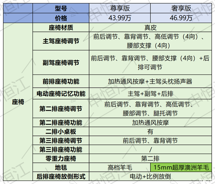 1,座椅简单说一下,二排两个零重力座椅、均可以前后移动,有轨道。二排小桌板是左右两个,看官方配置,显示有羊毛地毯:低配是高档羊毛地毯、高配是15mm超厚澳洲羊毛地毯。