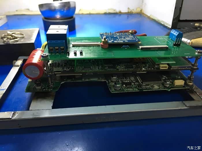 8寸屏被包在铁架子里,上面有MPS导航的原主板主要控制开合,在最下面一层。中间黑色主板是安卓系统的主板。上面的就是我为了方便走线而做的板子,以前的帖子有提到的。