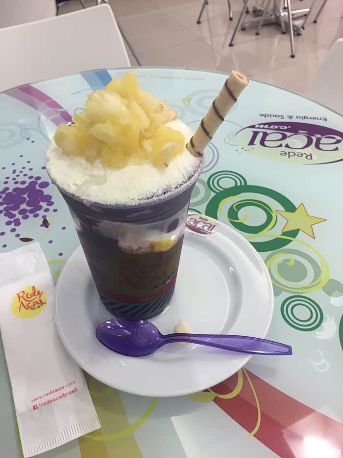 到了巴西必吃的Acai,一种亚马逊流域出产的莓,抗衰老,抗氧化的,只能做成冰激凌和酒,真心好吃,每次去我都吃,吃到上瘾了,巴西国宝之一,另一个就是Guarana了,每次我也是喝个过瘾。Guarana的存在,可是巴西销量最大的饮料,全世界唯一一个没有被可口可乐盒百事可乐公司占领销量前二的就是巴西,Guarana是老大!