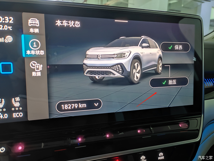 从购买ID.6 CROZZ开始,我就觉得胎压检测是非常有必要的,但是仅仅是监测还不够,最好还是能显示出具体的胎压数值。因为车子在行驶的过程中,与地面接触的部位就是四个轮胎,随着车辆的行驶以及外界温度的不同,胎压的数值都会有相应的变化。根据数据显示,正常的轮胎的标准气压是2.4-2.8kg/cm。