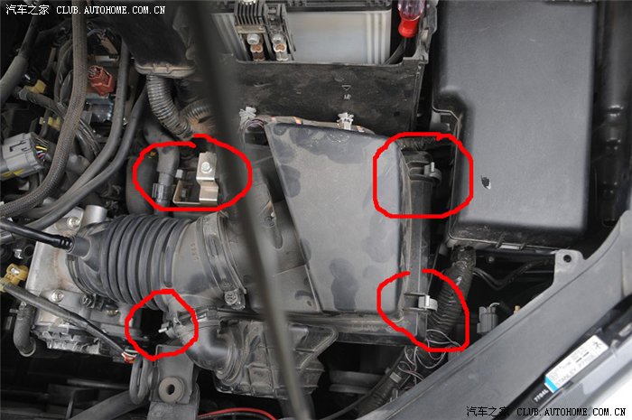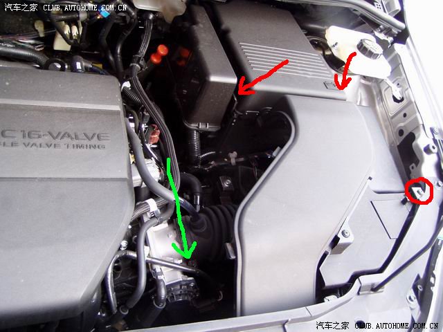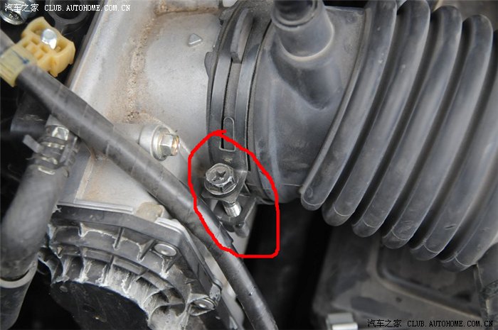 先松开两个箭头的卡子拿开电瓶盒的盖子,然后松开红圈内的螺丝拿掉那个盖板,最后松开绿色箭头的螺丝拿开进气管露出节气门