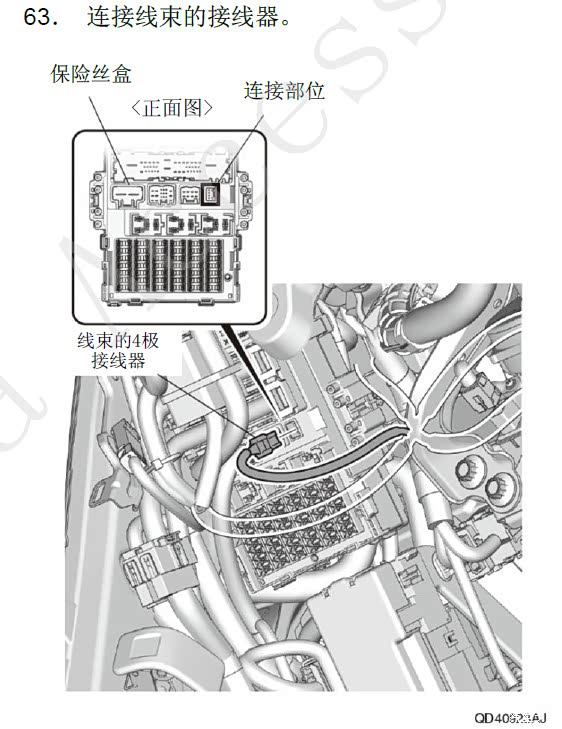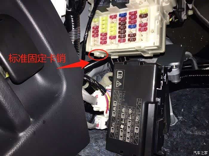 本线材中8PIN转接插座的固定方法可以参考此图中保险丝盒的外挂方法,将8PIN转接头固定到保险盒底部的预留卡销上