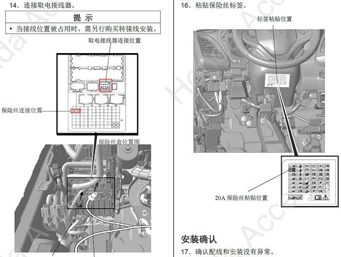 【注意】:8PIN选装插接器中的常电针脚在初始状态是没有通电的,需要在白色保险盒的2号保险丝位置插入一个迷你型20A保险丝,常电针脚就开始通电了,这是本田出于安全考虑的一种措施。