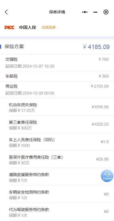 保险:先来聊聊保险费用吧,上个月刚购买了保险,商业险+交强险+驾乘险4185元,优惠800元,最终实付是3385元,这个价格对于帕萨特第三年来说还是偏高了些,但是我综合各项考虑,还是选择了在4s店购买保险,其优势就是出险后处理起来十分的方便,不用和保险公司扯皮,所以我宁愿多花几百也在4s店续了保。