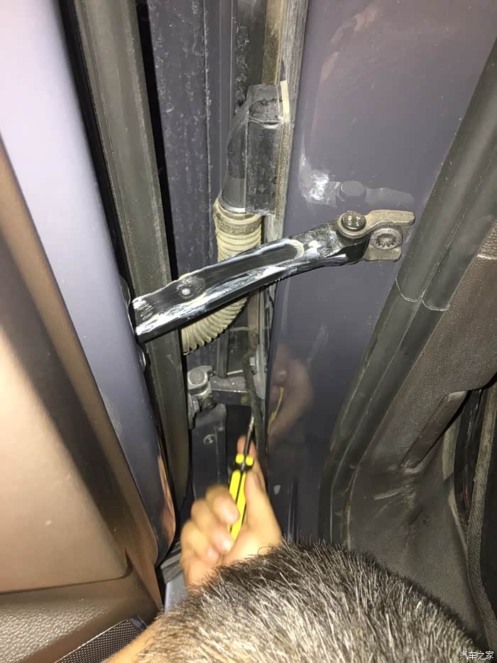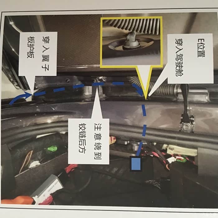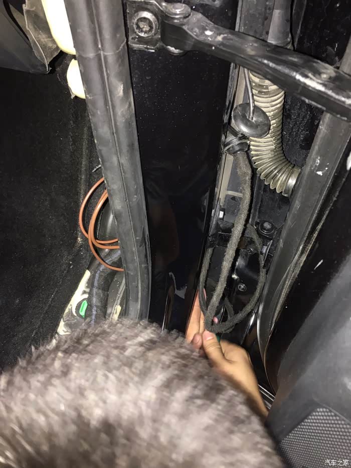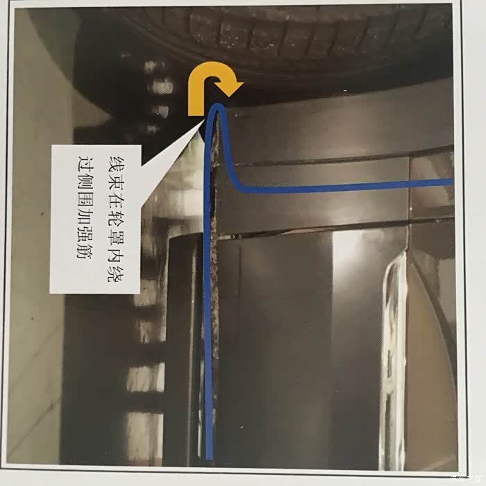 线束经车底,由叶子板侧向上延伸,一定要在限位器后面才可以,避免影响开关车门