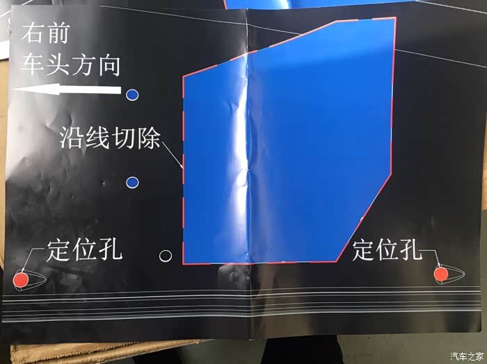 从包装箱里面取出图纸,以右前护板为例,可以清楚的看到定位孔和需要切除的部分