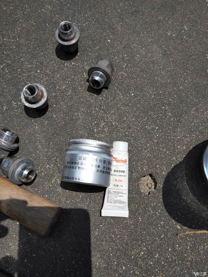 用力拆出导向销,清洁干净,加上专用润滑油脂。在道轨、分泵活塞、卡钳涂上消声膏。