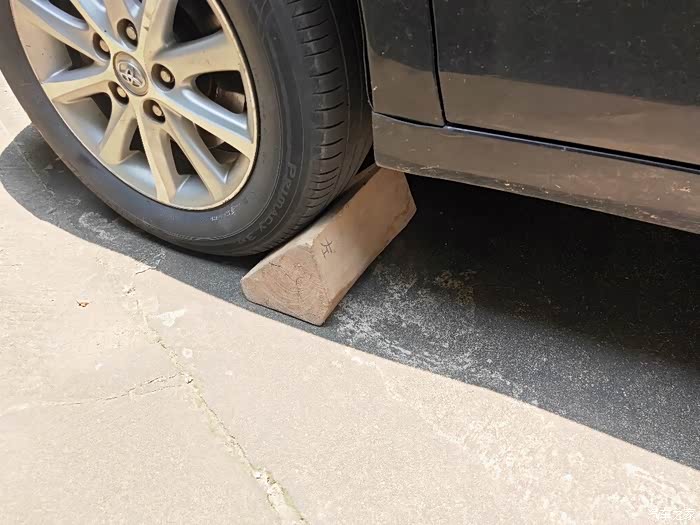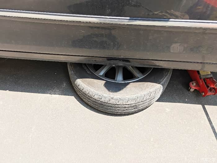 拆下的轮胎,依照惯例放入底盘,防止千斤顶失效或防止车身跌落。