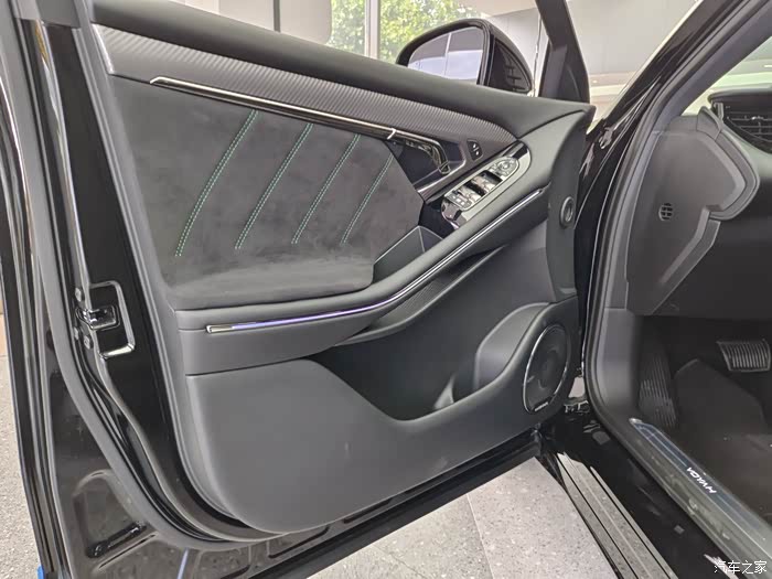 方向盘以及门板的镀铬按键同样也做了熏黑处理,门板上还新增了部分仿碳纤维的饰板,车顶棚也换了深灰色的材质,整体设计感很协调。