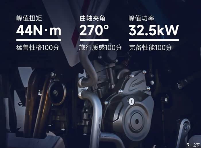 动力部分,春风450MT搭载的是一款270°曲轴夹角设计的双缸水冷发动机,内置双平衡轴,低扭表现十分强劲。并且该发动机采用了锻造活塞、全铝镀陶气缸体、镁铝合金气缸盖罩等,测试累计4500小时全负荷状态下无故障。参数上,该发动机最大功率为32.5kW(44马力),最大扭矩44N·m,在6250转速就能爆发。除此之外,官方还优化、减小了油门行程,爬坡、跃障动力输出更为直接。