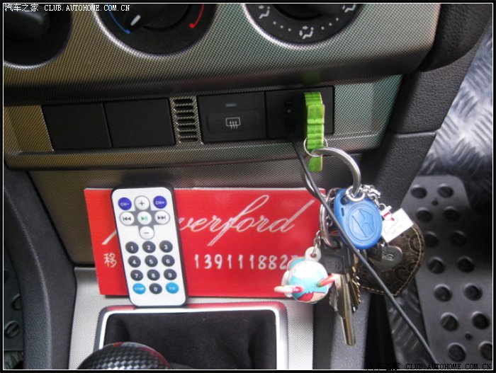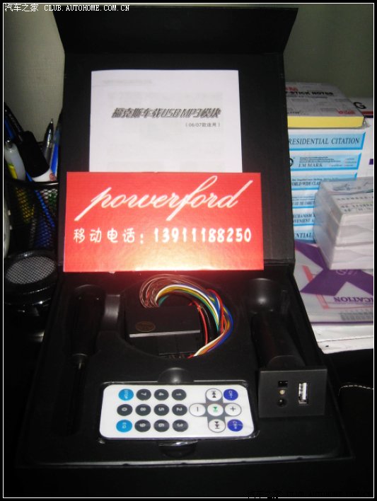 出了09款以后~一直很嫉妒09款直接插个U盘就可以听歌的功能!~老款福克斯却很委屈的在手套箱里才有一个AUX接口!~很是不爽。前几天一个厂家联系我,问我有一个产品是否感兴趣!~本来我对于主动推销的行为非常反感!~但功能比较吸引我!~大概意思就是给老款福克斯的原车音响主机上添加一个U盘插口,直接可以U盘听歌!~!抱着试试的心态上了几套!~!东西一到第一时间安装在自己的小黄上!~居然能用!!!哈哈!~而且音质还不错!~配有遥控器可以选择歌曲!~可惜没有09款那样的歌曲名称。音效也有几种选择!~还算满意!~推荐给老款与我一样有需要的TX们!~!