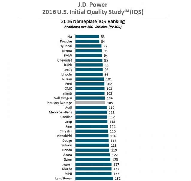 此次调查中,保时捷、现代、丰田和宝马等外国品牌获得高分,而底特律三巨头(通用汽车、福特和菲亚特克莱斯勒)在汽车质量上也持续取得重大进展。