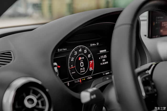 内饰布局不同于更高级别的A4、A6,这辆车的内饰设计更偏向年轻化,四个圆形的空调出风口和精简的空调按键,让人一眼就能认出来这是一个A3,当然不同于A3的是大面积的Alcantara翻毛皮,触感和视觉效果都很好。还有全液晶仪表和S方向盘,让驾驶的人随时清楚自己开的是一辆S3