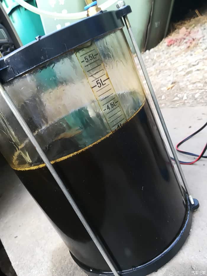 抽出来的旧油,桶身标尺是正好4升。这个桶有点误差,比实际少0.2升左右。
