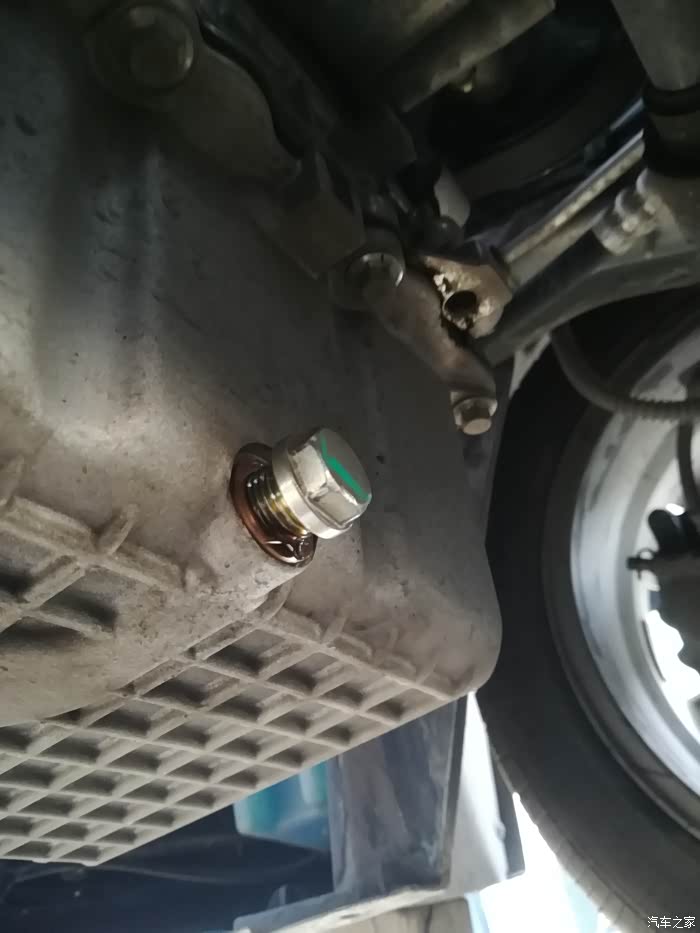 打开油底壳放油螺栓,这个铜垫子能多次使用,没必要每次都换。拆掉放油螺丝后,虚打火数次,又放出大约0.2升旧油。