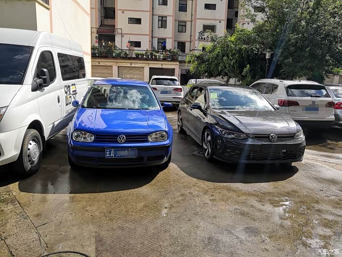 下面一段话是今天10月5日早上加上的:提车时,高八GTI与2T虎见面合影了,但一直没有拜见过老爷车2.0手档狼堡版狗夫四,昨天特意把老爷车请出来,与新成员合个影,“以示公平”: