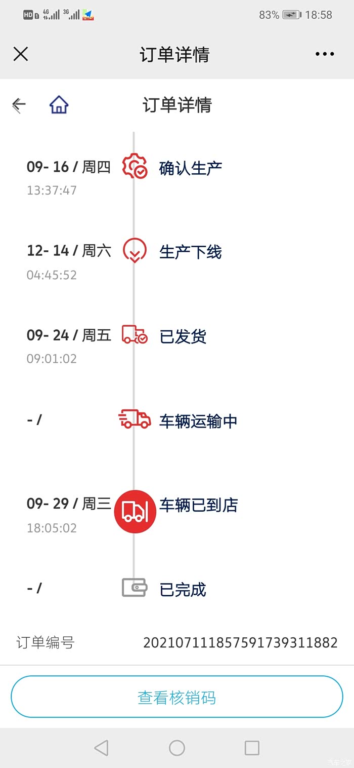 9月16日,漫长煎熬、毫无消息的两个多月过去了,等车等得鬼火绿的我,终于收到短信:车辆已生产下线,即将完成生产,请耐心等待。订单也从67天来“雷打不动”的“支付”状态直接更新为“基地入库”状态(没有经历“生产确认”状态);