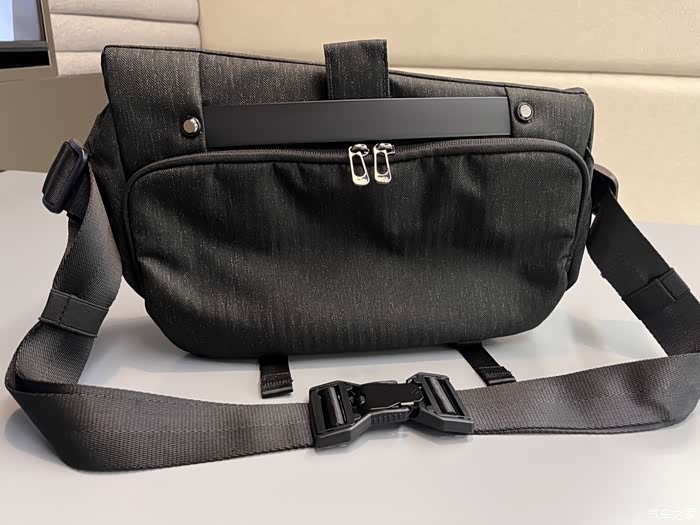 整体外观的颜色是黑色的,材料我摸着比较像合成材料,看着感觉应该能防水,搭配上银色的五金,感觉档次一下就上来了,目前来看魔术贴的粘性还是很强的,希望用久了以后不会跟我之前的包一样粘不牢。
