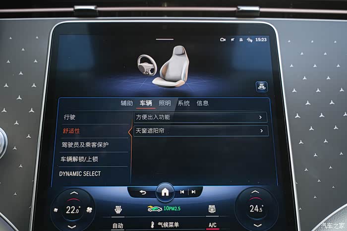 关于车辆的一切设置都可以通过中控屏幕来完成,只需进入车辆模块,在列表中逐步设定即可,不会出现许多繁琐的层级进入。空调的温度,循环、出风等方面设定也在此屏内完成,十分便捷