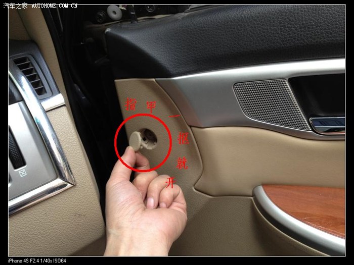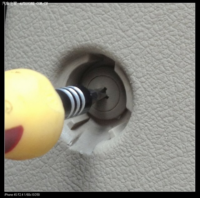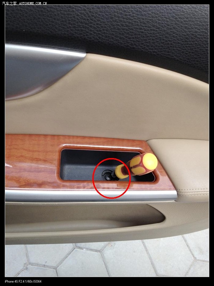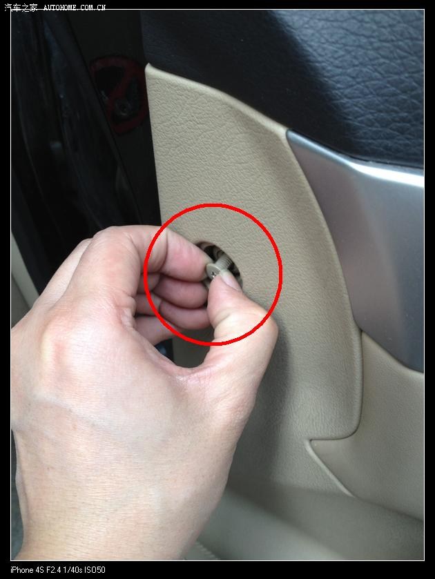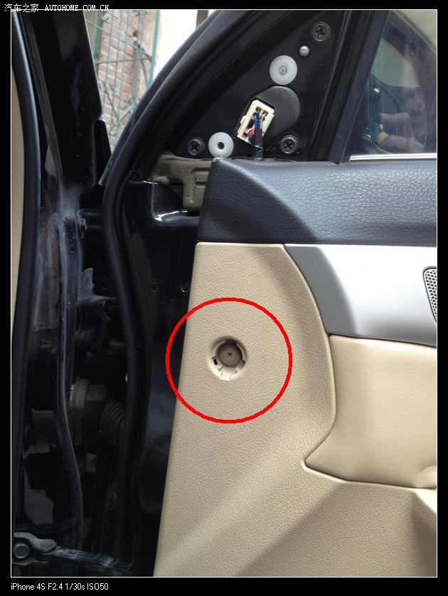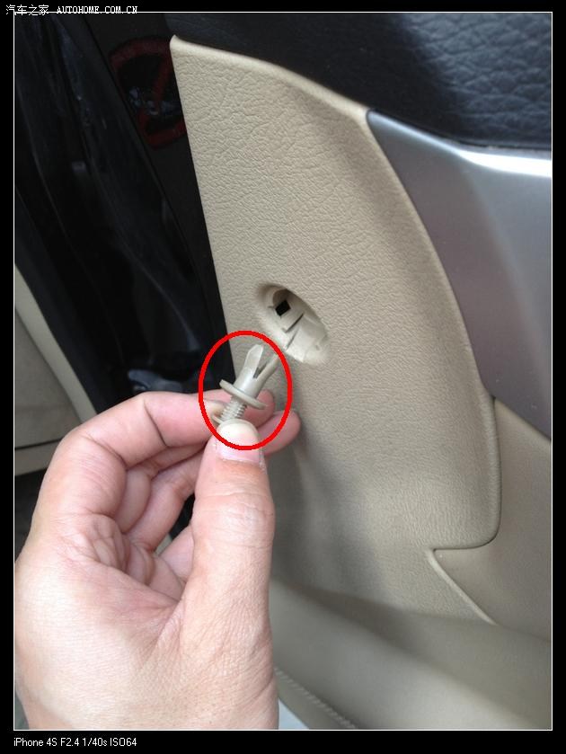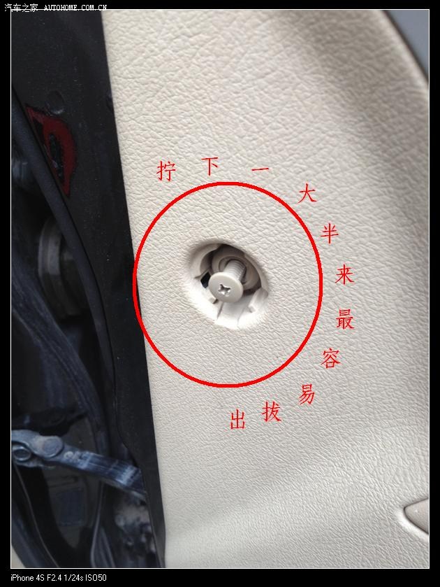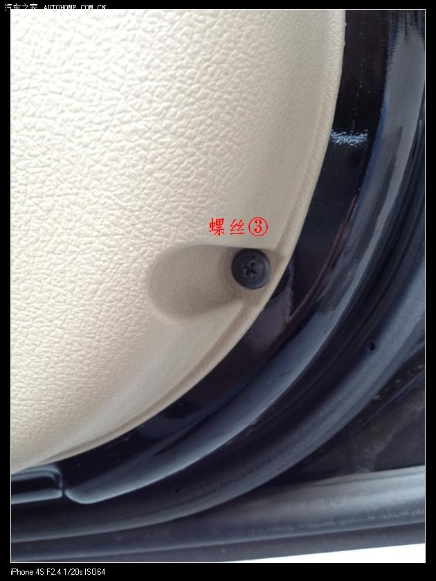 ③ 内饰板靠近车头方向那一块的米色圆形盖内隐藏的塑料螺丝拆下;