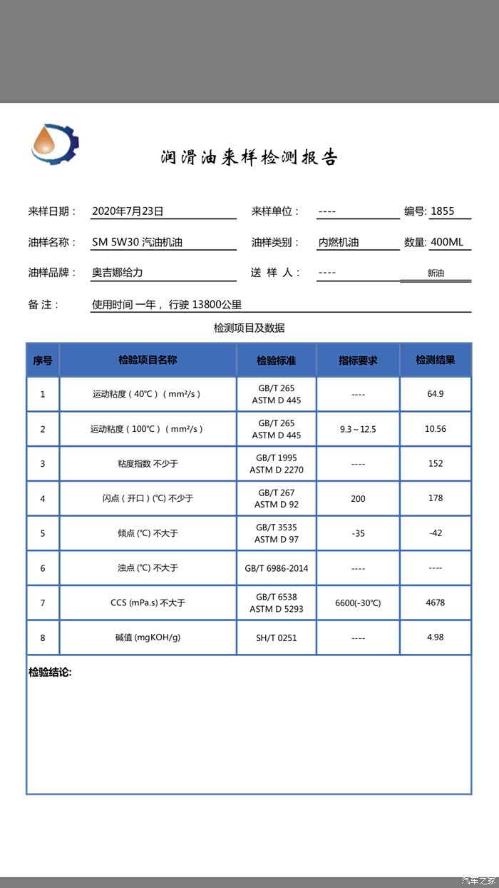 机油送检第214篇-奥吉娜给力5W30 13800公里测试