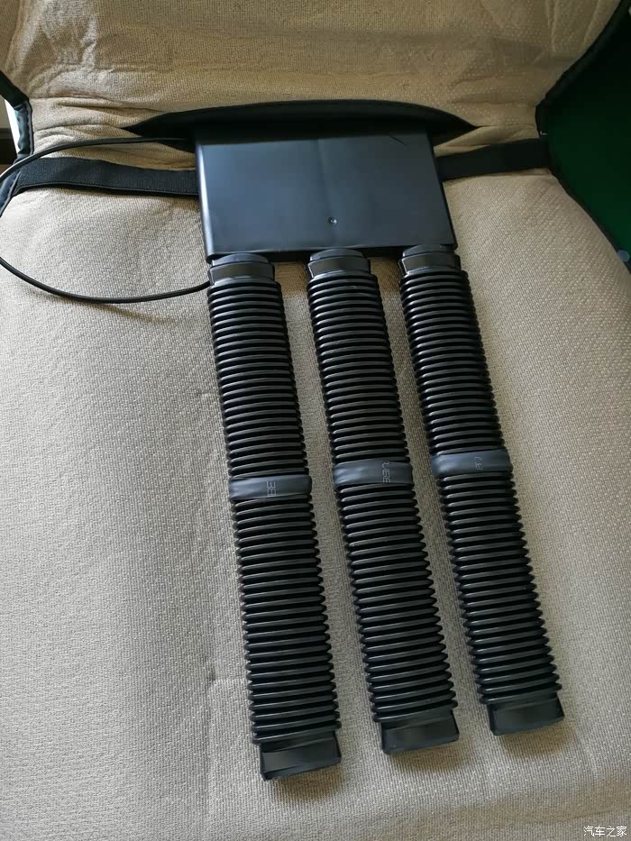,给发了一套短管子(原配的一半长)及另几样小备件,打算以后改一下,现在暂时就这样吧,先试试看效果如何。不用不知道,一用真奇妙,效果简直不要太好,不管天气多热,上车打开空调,首先舒服的就是后背和屁股,风量只需开一点点就足够,大了还受不了,噪音完全可以忽略,感觉称之为空调座椅都完全不过分