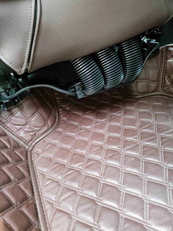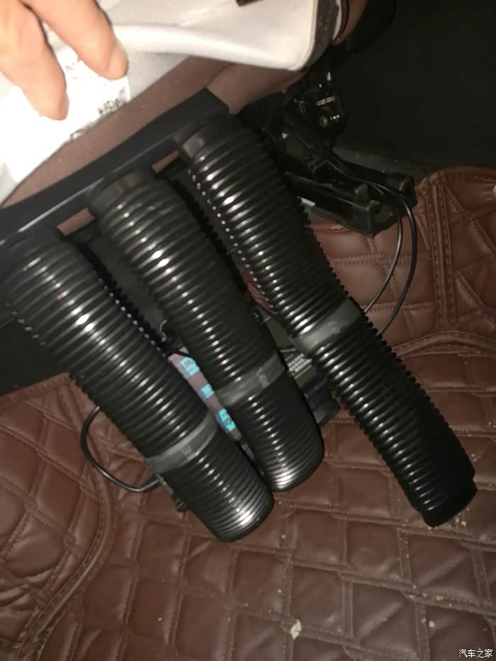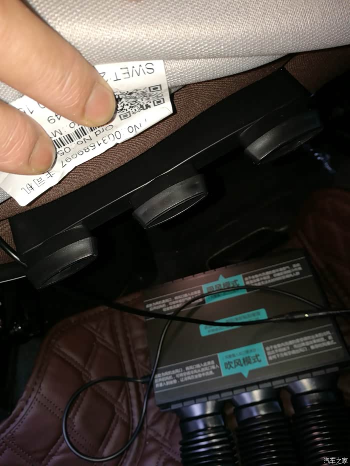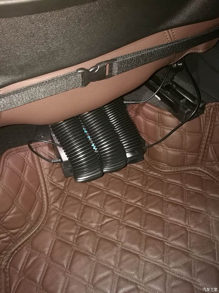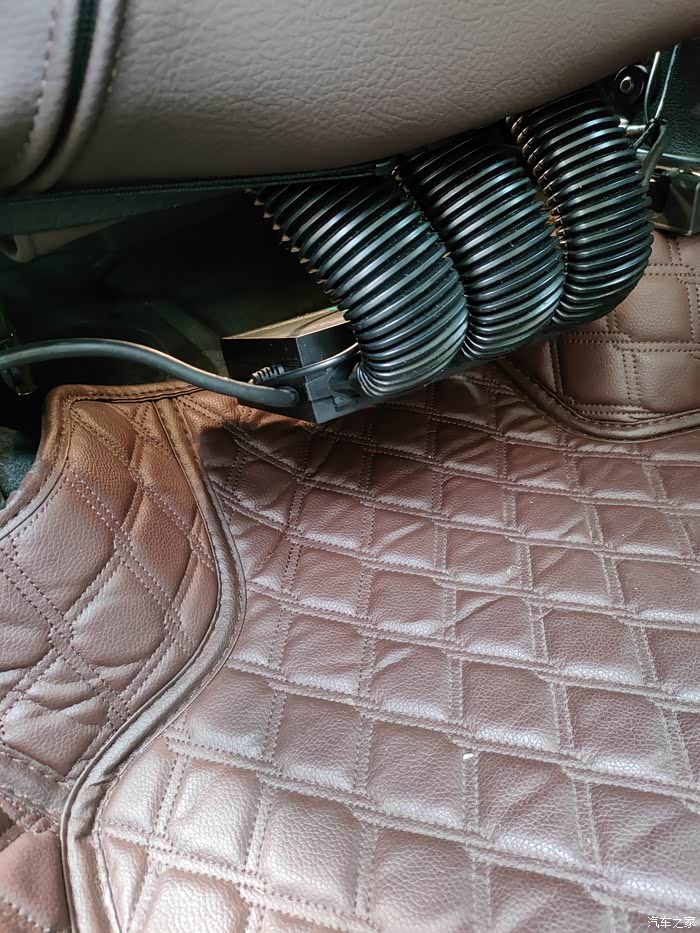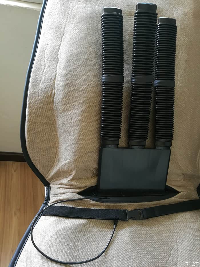 扣上坐垫自带绑带,连接风管和主机,电源插到扶手箱点烟器就完事。主机就放地板上,进风口对着空调出风口。风道和管子长度角度均不合适,拐了好几个弯,不太好连接,还把靠背那块皮革顶得鼓起一个包,不好看