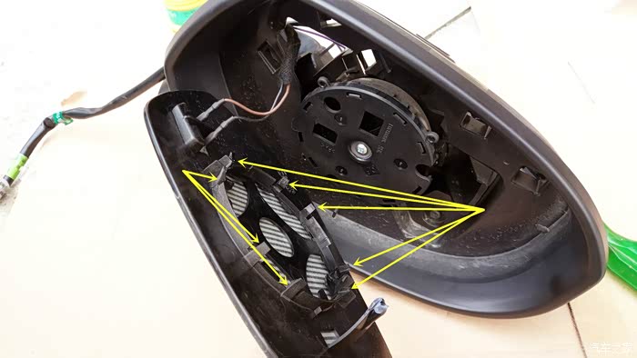 现在我们要把镜片拆开,但是不能直接掰,会折断,在镜子背面有6个卡扣,我们要用螺丝刀从背面的孔插入一个一个卡扣撬开,这样镜子就能直接拿出来了,如图所示,8个固定的卡扣就是如箭头所示位置。