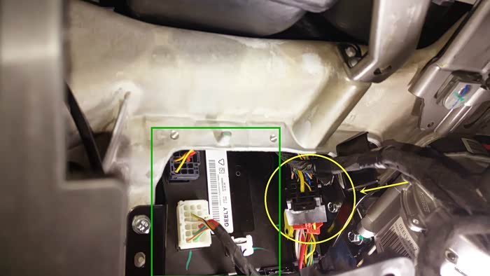 图片里绿色框就是保险盒原先安装的位置,黄色圈就是拔出来的行车电脑主机电源插头,不拆保险盒基本碰不到这个插头,更别提还要插线了。