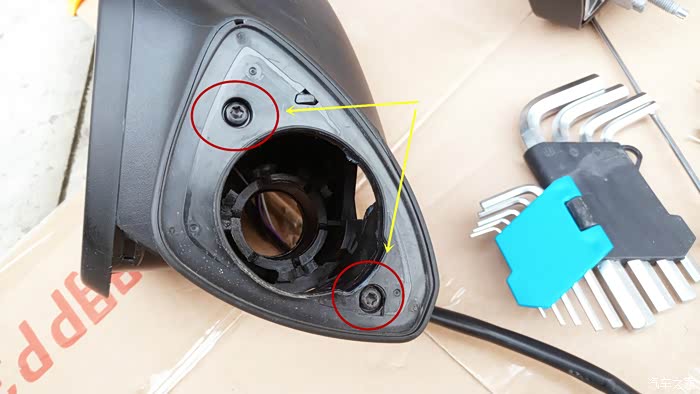 在后视镜底座后面有维修孔,通过维修孔可以看到内有固定后视镜的3个螺丝,螺丝需要用10#套筒打开