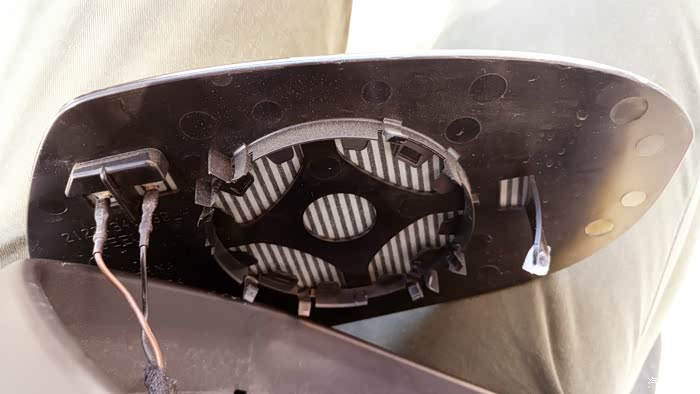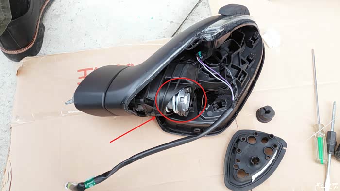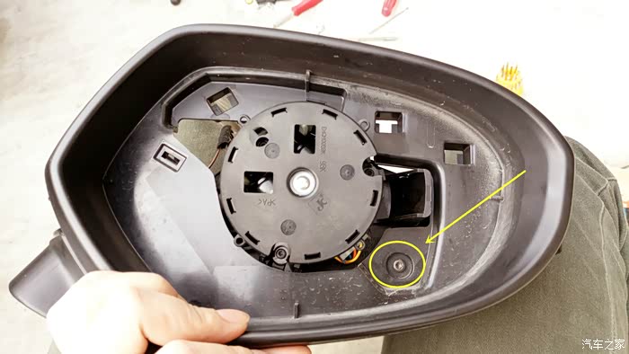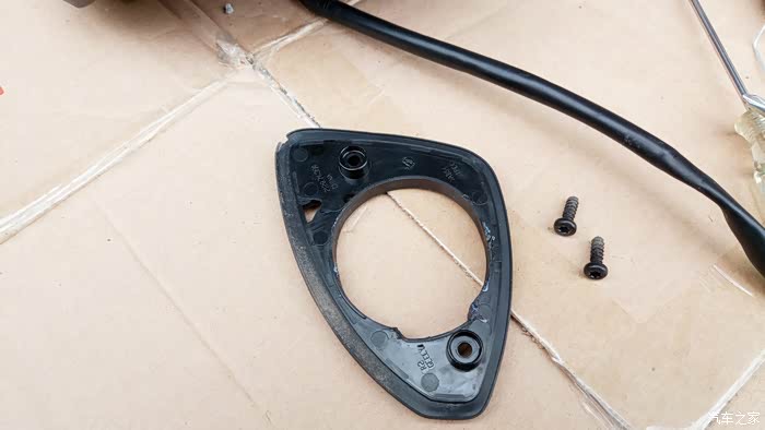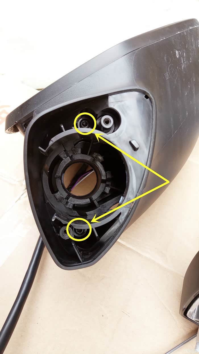 打开胶圈后在下面还有2个一样规格的螺丝,也要拧开,这2个是镜片角度调节电机底座和后视镜的固定处,有3个螺丝,这是其中之二,另外1个在镜片后方