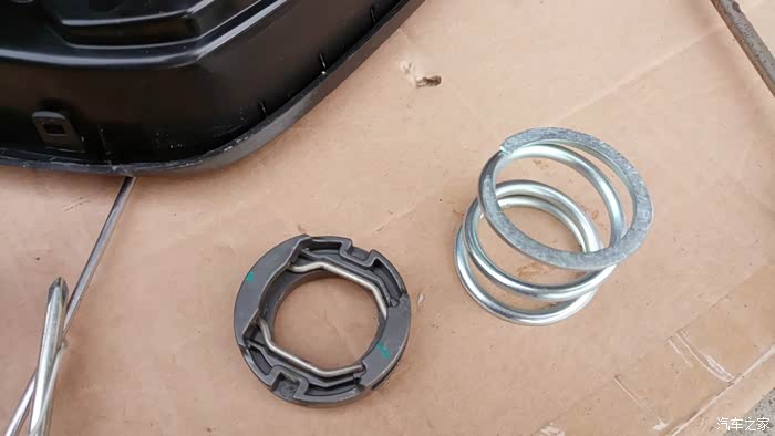接下来我们要把后视镜和底座分离,要拆开红圈上固定弹簧的塑料圈,这个好家伙,易拆难装,最好先想好方案如何装上,不然一旦拆开,呵呵,你就别想装上去了,因为弹簧力度相当大,2个手指都难以压动它,更何况压到底还要旋转卡上,人力无法破解的,拆开的话 上面的卡扣只要用尖嘴钳卡住旋转就开了。