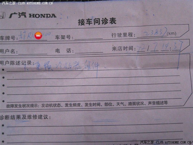 4S店帮我报了保险,没几分钟保险公司的人就赶来了。剩下的关于定损方面的事情4S店全部帮我搞定了(在这里我要赞一下4S店,他们的办事效率很高,让人很省心的说!!)定损之后,4S店马上打电话到广州,叫他们发货上来,因为4S店只有2.0 和 2.4的冷凝器。